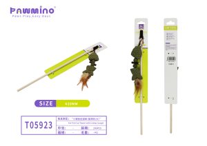 Large cat teaser with fish shapes and feathers.