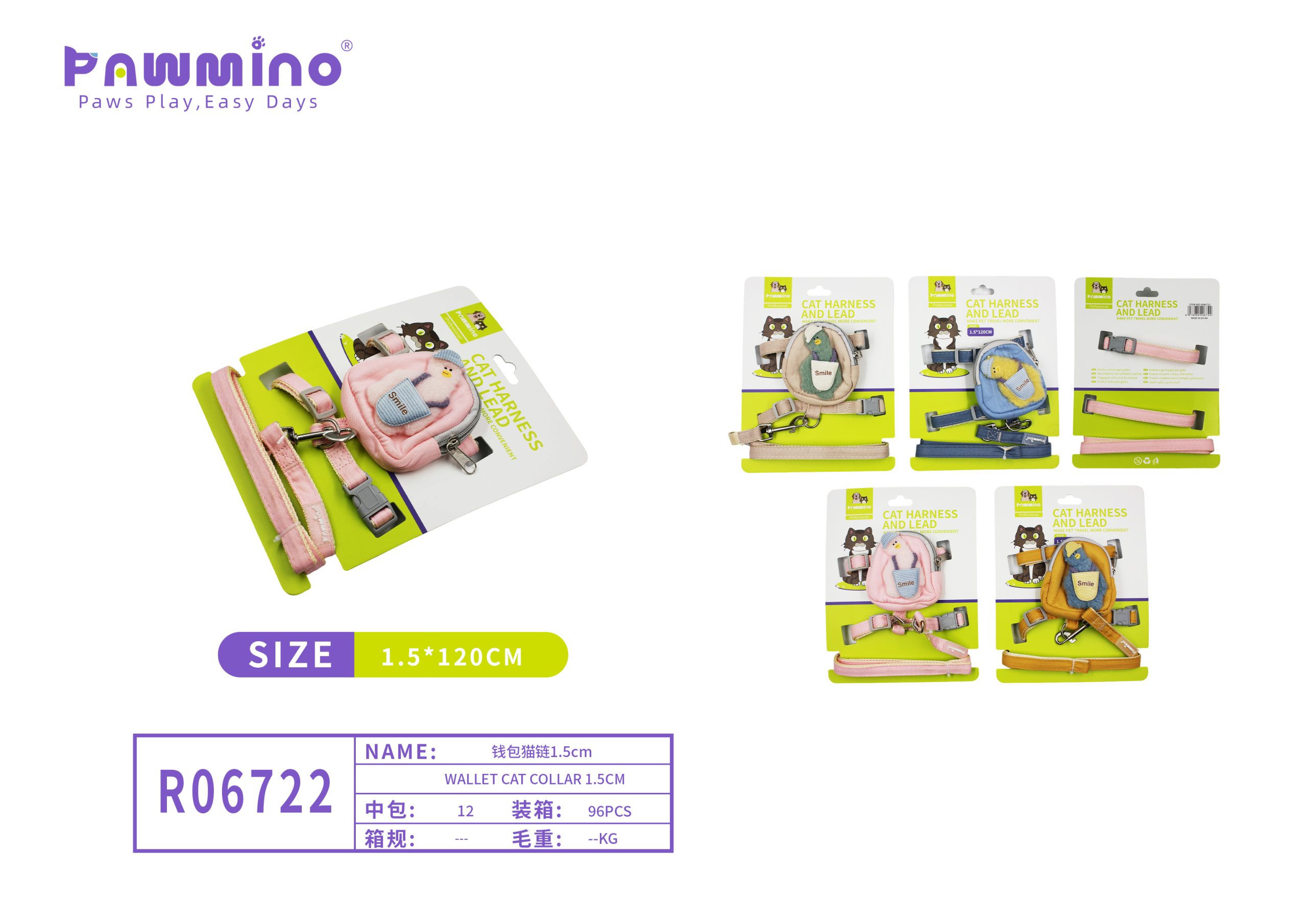 Unique cat harness with small pouch design and matching lead (1.0x120cm), ideal for carrying small items.